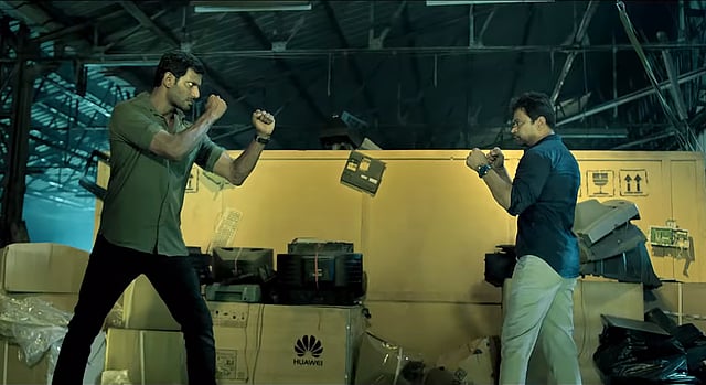 Frankly, I didn't know that he was going to contest in the by-election when we were shooting this scene in November-end in Tirunelveli. I randomly bought a newspaper for that scene and it happened to have that headline. Only in early-December, when we were about 9 days from total completion of the shoots, did Vishal coolly come and tell me that he was going to contest in the RK Nagar by-election.