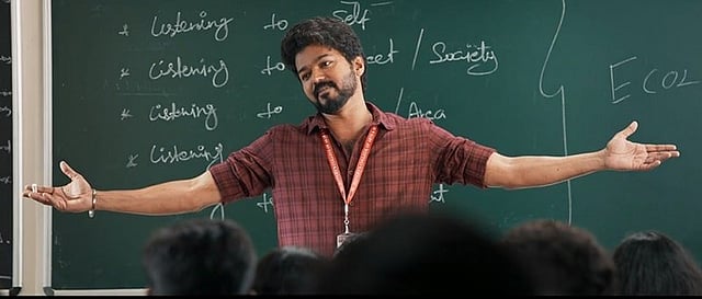 As per the norms, we have a hero and a villain. The hero is J.D. (Vijay), a devoted alcoholic who may very well have his morning showers with a bucket of Jack Daniel's. The black shades conceal his red eyes. The bracelet adds to his swagger. He dresses up like a college student, complete with earphones sticking out of his ears. In reality, he is a college lecturer. J.D. is a hit among his students. They worship him. Not because of the outer appearance, but for his dedication towards the betterment of the students. In an early scene set against the backdrop of an alumni meet, we see the reason behind this idolisation. Turns out J.D. extends help beyond the boundaries of the university. He helps in punishing two scumbags who had misbehaved with a girl in the college. The authorities and the staff are incompetent as expected. As J.D. chases the scumbags, we enter an exciting chase sequence moving from a bus to a train to a rickshaw.