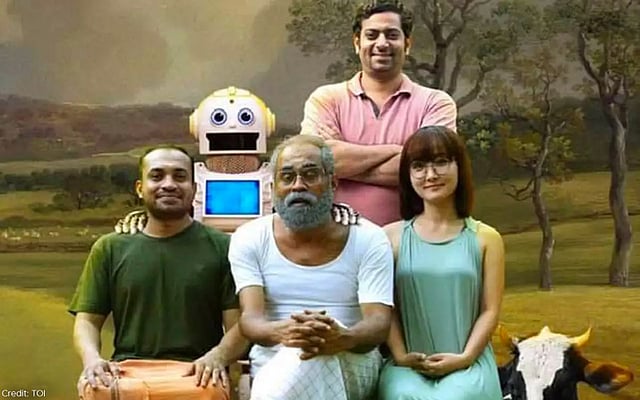 Therein lies the real beauty of this film. As the film zooms in to give you a closer look of this place and its people, we get characters such as the sly newspaper boy whose 'likes' Facebook pages such as 'Communist' and 'Ayyappa Devotee Sangam'. We also get the helpful relative who points to a picture of Bruce Lee and calls him Mafia Sasi. And, when two elderly neighbours make a hilariously formal visit to meet the new robot, one of them asks its owner why he hasn't given it any clothes to wear. We see the temple, the muddy streets, the temple pond, an old house and a lot of greenery. It's as though cinematographer Sanu Varghese took special care to stay as far away as possible from the colour blue. So, when the Android arrives in this village with its bright blue eyes and big blue screen for a heart, the contrast makes the robot feel as alien to us as it does to the others in the village; It's like ET has landed.