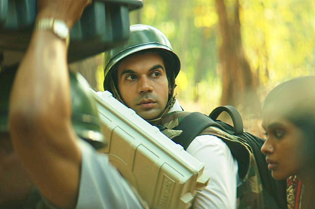 I can't get enough of Pankaj Tripathi (as supervising officer Aatma Singh) and Rajkummar Rao in the same frame. Together they have owned 2017 with their craft, much of which is visible here in their amusing battle of worldviews. We are cinematically conditioned to expect one of them to affect the other, or perhaps Tripathi to grudgingly admire the young upstart, but every character is too self-made to embrace conventional storytelling patterns. The film also quietly invests into the region's politics; the troubled locals soon sound like forcibly herded pawns torn between the communist rebels and military forces. They speak, complain and comment in a "documentary" manner. When asked if she is a pessimist like her male colleagues, Malko (Anjali Patil; fiercely dignified), a local well aware of their mission's futility, simply replies that she is an Adivasi.