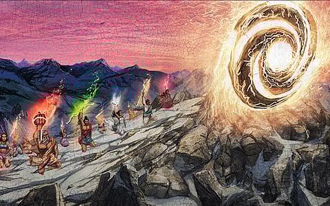 The sages who become custodians of these weapons call themselves the Brahmansh and use their powers for the good of the world. Their wisdom and powers are passed down the generations, all the way to the present. From what we've seen in the trailer and this video, when the Brahmansh get together, you get a neon whirlpool as the energy of the astra beams out of each member.