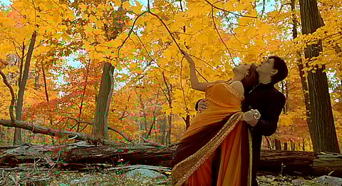 When Johar's characters fall in love, they often lip-sync to a love song that is, in Johar's own words, "beautifully mounted". This means taking his characters to a stunning locale in gorgeous Manish Malhotra outfits. In Kuch Kuch Hota Hai, the three leads sing the title song against a backdrop of lakes, hills, fields and forts in Scotland. Kabhi Khushi Kabhie Gham featured Rahul and Anjali singing 'Sooraj Hua Maddham' against the pyramids of Giza. In Kabhi Alvida Naa Kehna, Dev and Maya confess their love for each other by singing 'Tumhi Dekho Na' in New York City. In Student of the Year, the three leads sing 'Ishq Wala Love' in snowy Kashmir. "We were showing off. That's what we do in songs like this: we show off," said Johar. In Ae Dil Hai Mushkil, he parodies his own trope by showing Ranbir Kapoor falling prey to hypothermia while dancing on snow-capped mountains.
