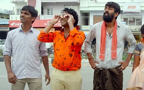 Our five-member film crew visits what looks like the exact same location each day to shoot various kinds of scenes: romantic, action, sentiment — they all come out wonky. What keeps these sequences watchable without feeling repetitive is the detailing. For instance, there's Maridesh Babu's friend Suri (Anji BK) who appears at intervals, taking his micro arc of the story forward, one amusing line at a time. There's also a kid with a clearer notion of filmmaking than Veerababu and Ganapathi, maybe because he's used to living in a world of make-believe; he's employed as a consultant.