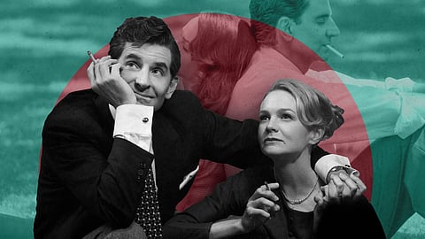 A man is sleeping next to him, David Oppenheim (Matt Bomer), and in one rambling take, the camera follows Bernstein playing drums on his lover’s bum, from his room to the concert hall. The camera swoops onto the stage and back to his face, among the audience, a dream-scape of euphoria. If A Star Is Born established Cooper’s directorial voice as something extraordinarily tender, his penchant for visual staging, Maestro takes it to its flashy peak. The texture of the scenes in black and white are so rough, full of harsh backlight, the sounds are so clear, like the cigarette being sucked, the tobacco singeing, and even the sound of a cigarette being sucked when the fire has left it — that lacking crackle, which is also, strangely, a sound.