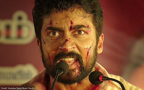 In NGK, Suriya plays Kumaran, an organic farmer (M Tech, Ph.D.) and overall local do-gooder. One night, he finds a political party worker (Bala Singh) lying by a dumpster, bloody and wounded, and his first impulse is to…do good. He helps the man up. As they begin to walk, the man explains what happens. He wanted money for his daughter's wedding, but when he asked his MLA for help, the latter asked to sleep with his daughter. The party worker refused. Hence his current state. He says educated people like Kumaran should do good, yes, but this isn't enough—they should enter politics. Kumaran is not convinced, but the shot tells us otherwise. Sivakumar Vijayan's camera has followed the two men from the dumpster, and as they climb a flight of stairs to the high ground, we see a gutter behind them. The gutter recedes in the background as they reach the top of the stairs, where we see a banner with MGR's picture. See what just happened? The two men started out in the filth and now they've journeyed to a (metaphorical) great height, symbolised by a do-gooder whose name comes with three initials (MGR/NGK).